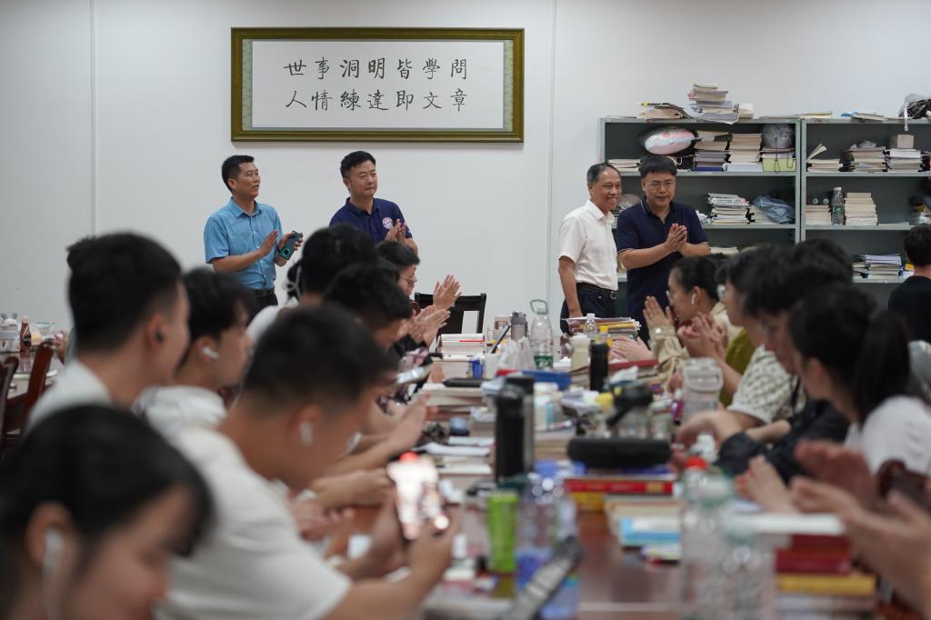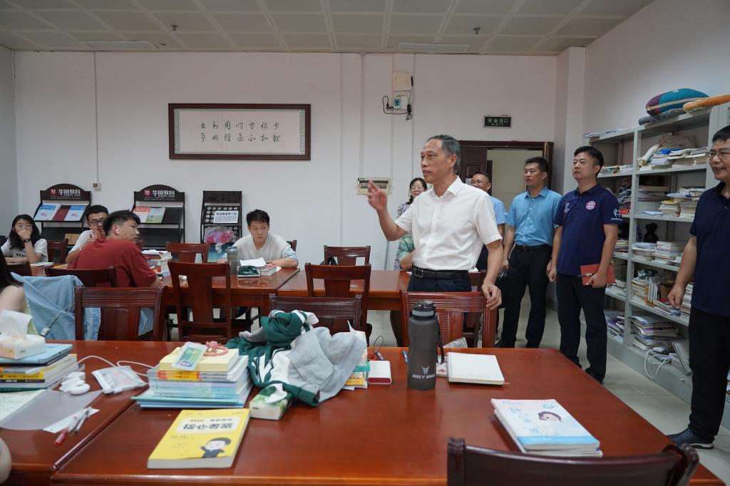 刘铁铭一行来到考研自习室,亲切地向同学们问好,关心询问留校学生的学习生活情况,了解同学们在学习生活中的需求。他叮嘱同学们充分利用假期合理规划时间,完成好学习任务,也要注意劳逸结合,做好防暑降温,学习之余锻炼好身体。铁铭书记鼓励大家:生命的价值在于奋斗,新时代赋予新使命,新征程呼唤新作为。他希望同学们珍惜时光,好好学习,增强本领,努力成为可堪大用、能担重任的国家栋梁之才。