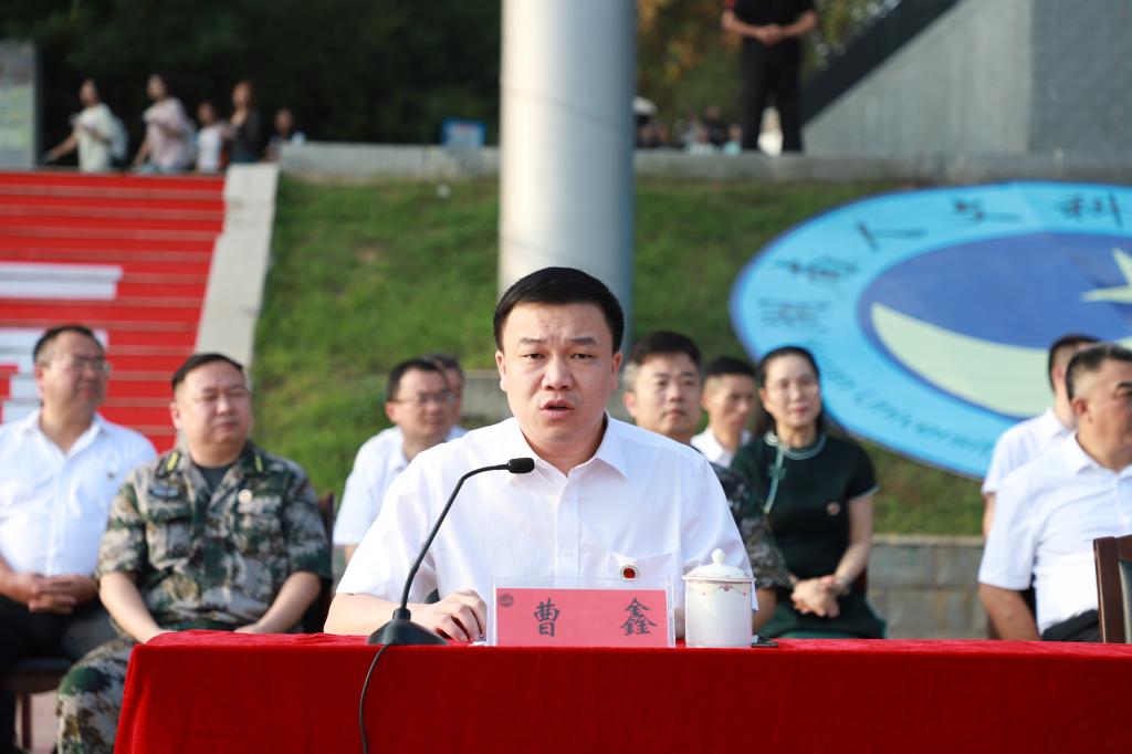 武装部部长、军训团团长魏彦煜作军训动员讲话,希望新生们在军训中坚持不懈,勇往直前。刘铁铭为军训团授旗。