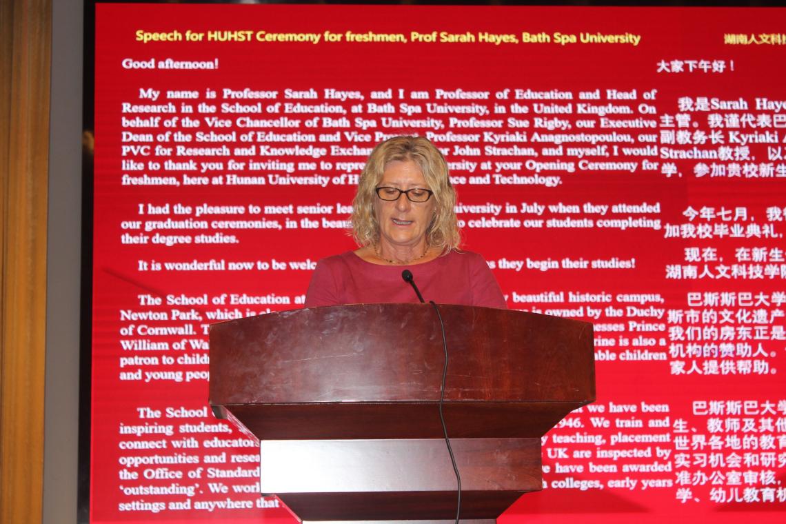 陈志国讲话,分别用中英文表达对新同学的欢迎。他指出,学校党委高度重视教育学院建设发展,希望同学们要跟上时代步伐,与时俱进,负重前行,用四年时间理解、探索、践行“为人之道、为师之道”,放飞梦想,追求卓越,成就自我,致力做听党话、跟党走,做有理想、敢担当、能吃苦、肯奋斗的新时代大学生,为中华民族伟大复兴做出自己应有的贡献。