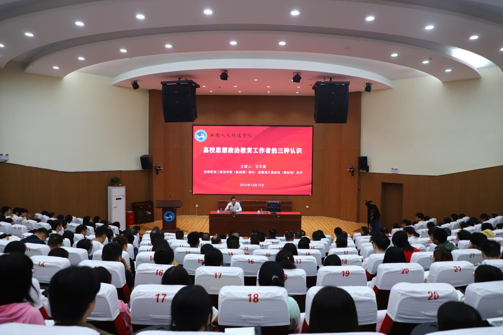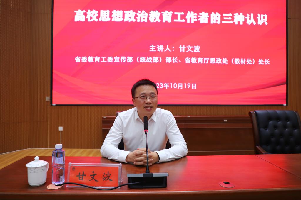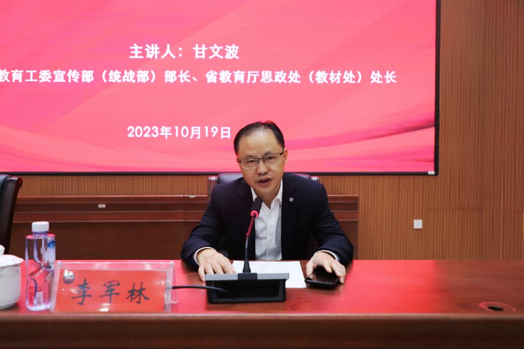 10月19日下午,省委教育工委宣传部(统战部)部长、省教育厅思政处(教材处)处长甘文波来学校做思想政治教育专题讲座。党委副书记李军林,党委委员、副校长陈志国,党委委员、纪委书记凌艳平,副校长刘建勋等校领导出席,相关职能部门负责人,各二级学院党总支书记、副书记,马克思主义学院师生代表及全校辅导员聆听讲座。党委副书记李军林主持。