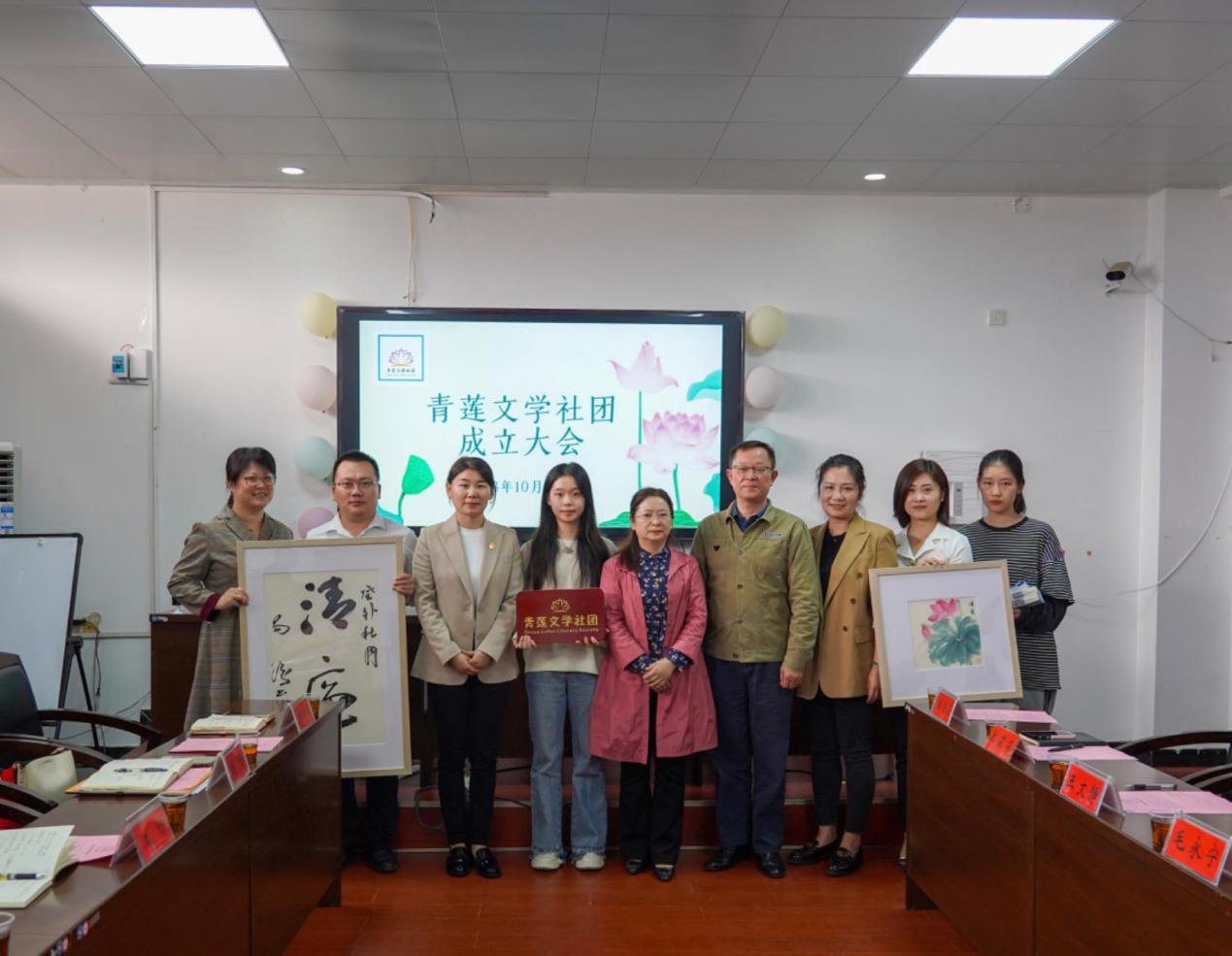 随后,刘佳为青莲文学社团授牌。校纪委副书记、监察专员办主任江彤为青莲文学社团送上由清廉文学作品、《清廉校园建设工作手册》等组成的“清廉礼包”。凌艳平为青莲文学社团送上美术与设计学院老师创作的书法和书画作品。