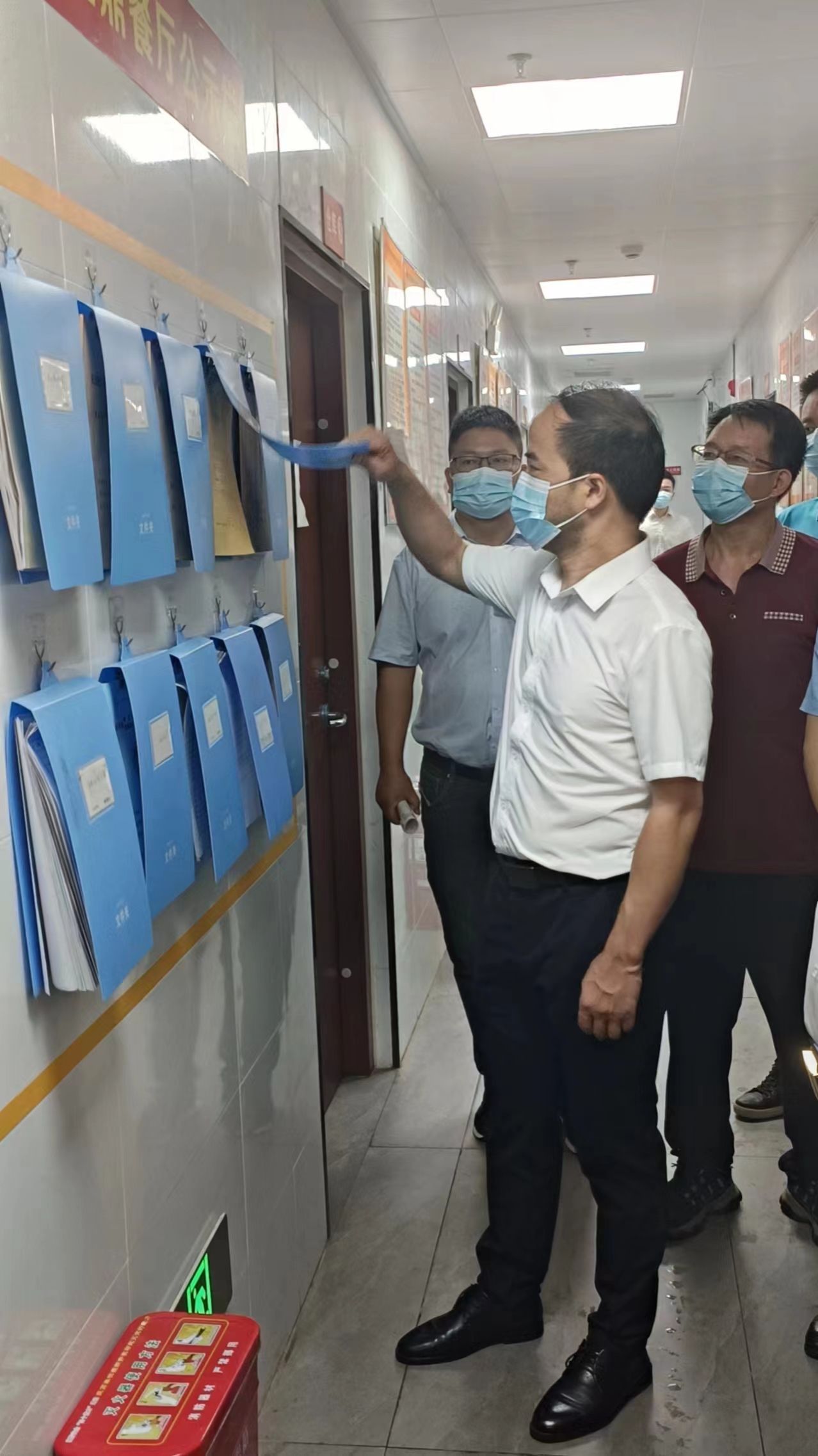 图2:KY开元集团官网入口校长盛明科仔细的查阅餐厅的制度登记表、对餐具消毒、食材台账及人员的日常晨检、午检、消防、餐厨垃圾分类等台账。