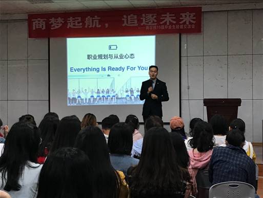 讲座以“职业规划与从业心态”为题展开。贺总首先讲述了大学生涯基本规划的重要性,分享如今的职业大数据,以此引出“实习就是一面镜子,会照出你就业的样子。看似寻常最奇崛,成如容易却艰辛”。他与同学们对自己的职业生涯规划进行探讨,根据不同年龄层的不同就业观并纵观大学生毕业就业形式数据和就业现状。他指出,大学生的职业规划应从早开始,同学们应该对自己有一个明确而精准的定位,从而在大学的学习生活中有目标地发展自己相应的才能,并且要学习更多的领域,跨行业延伸自己所学,增强自身实力,提高就业竞争力。