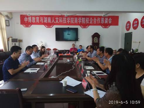 6月5日上午,商学院在同德楼会议室召开中博教育校企合作恳谈会。中博教育集团董事长毛金明一行4人莅临指导,校地校企合作处负责人,商学院全体院领导、教研室主任等参加了会议。会议由校地校企合作处处长黎建辉主持。