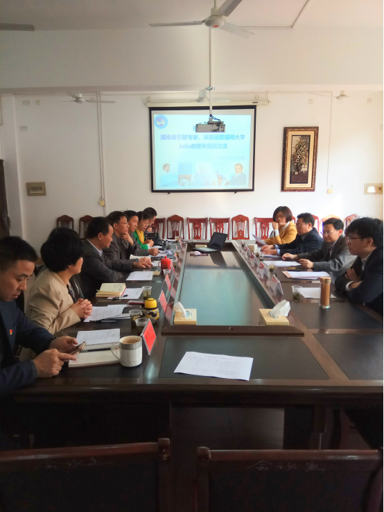 10月23日上午,湖南省引智专家、英国德蒙福特大学Julia教授见面会在商学院同德楼306会议室召开。党委委员、副校长陈志国,国际合作与交流处处长蒋冰清,商学院全体领导出席会议,人力资源管理专业等16名年轻教师参加了会议。会议由蒋冰清处长主持。