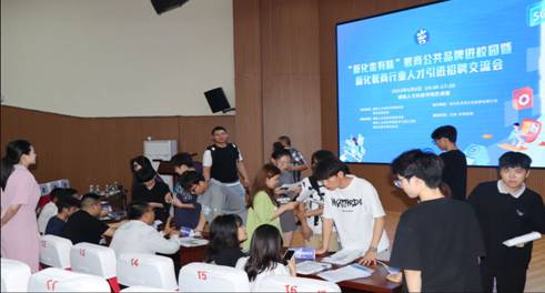 现场,湖南禾晖文化传媒有限公司、小小鸟电子科技有限公司、湖南丰谷食品股份有限公司、新化焦点文化传媒有限公司、新化县天龙山农林科技开发有限公司等5家新化县数字商务协会会员企业负责人进行双选交流发言,并架设企业咨询展台,为电商学子实习就业开通“零距离”答疑渠道。活动现场人潮涌动,求职者络绎不绝,特别是“电商运营”岗位成为同学们关注的热点。