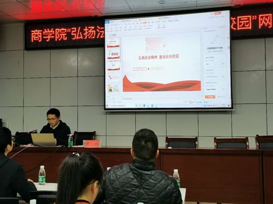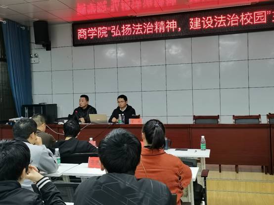 4月1日晚上,商学院在高韵楼101举办了法制教育专题讲座。隆回县司法局贺礼警官应邀做了“弘扬法治精神,建设法治校园”的主题报告,党总支副书记胡益龙主持,商学院全体辅导员、2020级班主任和2020级团支书与寝室长参加了讲座。