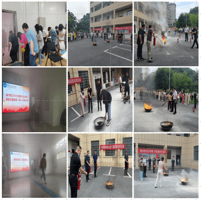 讲座后开展了应急疏散演练和灭火演练。师生按照狄老师的指导,从会议室有序撤离至高韵楼前坪。熊熊燃烧的柴火前,狄老师现场演示和指导灭火器使用方法,师生们积极参与灭火实操,切实提高了消防应急能力。