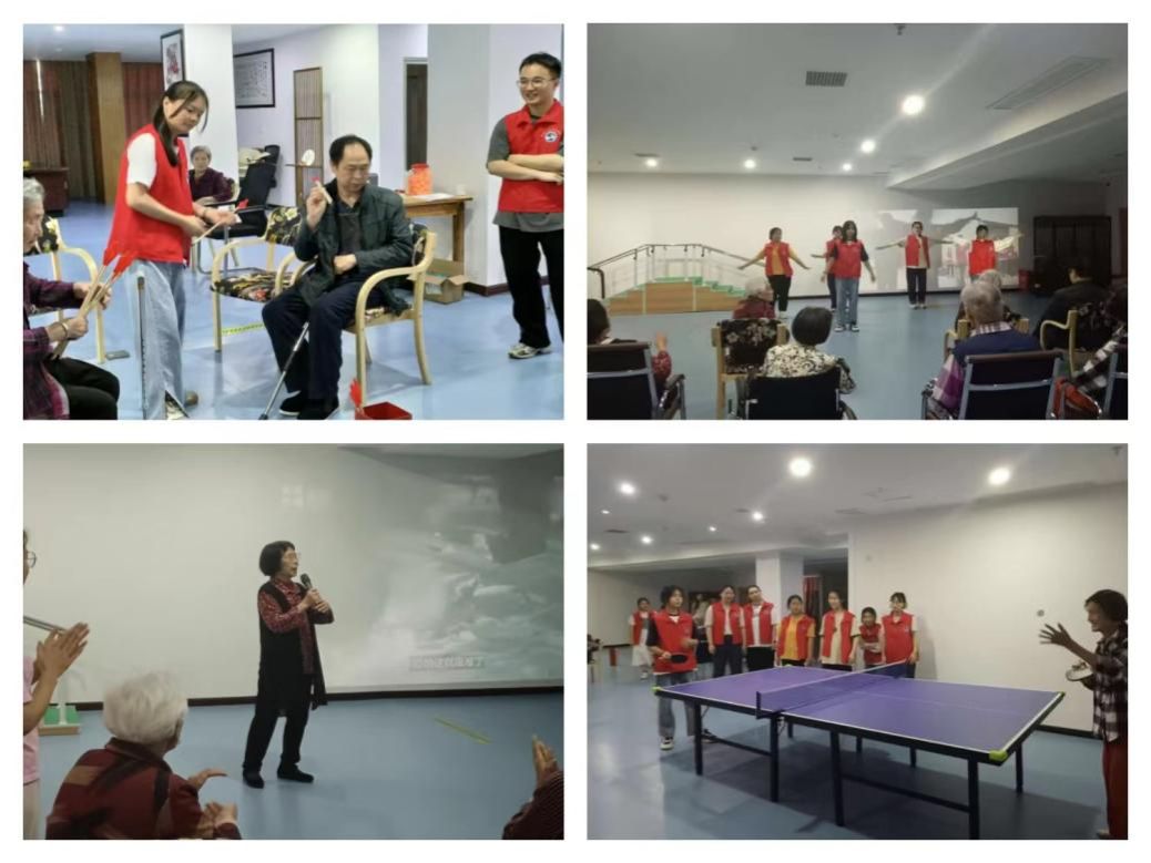“蓝天白云,最是温暖人心”。阳光透过窗户,落在彼此的肩头,此刻志愿者正带着医养院的老人们通过手指操来活动双手,缓解身体的疲劳。新面孔的到来给老人们带来了运动的活力,乒乓桌上他们打得有来有回,不亦乐乎;棋盘桌上他们斗智斗勇,旗鼓相当;投壶游戏中他们更是愈战愈勇,乐此不疲。此外,志愿者还给老人们带来了优美灵动的舞蹈表演,博得了老人们的阵阵欢呼和掌声。