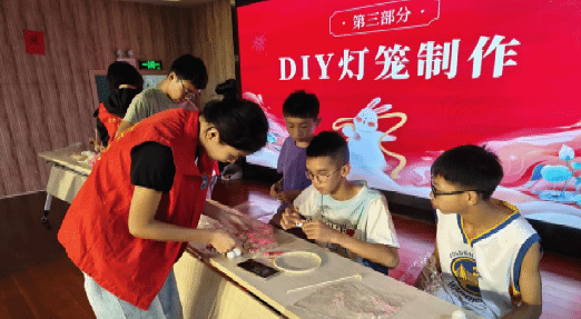 第二站,志愿者与福利院的小朋友一起动手制作精美的灯笼。从灯笼的基本架构搭建到如何添加装饰,每一步都凝聚着志愿者的耐心指导和小朋友们的奇思妙想。在大家的共同努力下,一盏盏造型独特、色彩斑斓的灯笼逐渐成型。