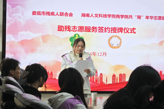 12月3日,一场意义非凡的助残志愿服务签约授牌仪式在娄底市残疾人联合会隆重举行。娄底市残联党组成员、副理事长刘妍熙,娄底市残疾人服务中心副主任李祥,KY开元集团官网入口校团委副书记张莎莎、商学院团总支书记欧阳纯晶、辅导员刘佳瑶以及共“商”年华志愿服务队的志愿者代表共同参加仪式。