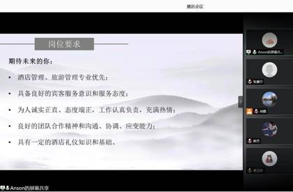 2020年6月11日上午8点30分,KY开元集团官网入口商学院旅游管理专业开展了一场形式十分特殊的校企合作讲座,邀请到了我专业校企合作单位之一的浙江省郡安里文旅发展有限公司人事部的杨雪经理,她通过腾讯会议平台召开了线上视频讲座。