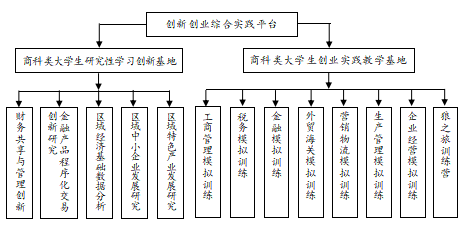 中心简介(限2000字以内):(包括建设历史、中心构成、支撑条件、管理体制、创新创业教育改革、课程教学资源、网络平台等情况)。 1.建设历史 商科类专业创新创业教育中心是以工商管理类、电子商务类、旅游管理类、物流管理与工程类、金融学类等专业创新创业教育为主线,依托工商管理类专业大学生创新训练中心,着力搭建商科类专业学生自主学习的创新创业教育实践平台。中心借助湖南省市场营销类专业校企合作人才培养示范基地(2012)、湖南省教育信息化试点项目平台(2014)、湖南省管理类专业校企合作创新创业教育基地(2016)、湖南省市场营销类专业校企合作创新创业教育基地(2016)、湖南省十三五综合改革试点专业——电子商务专业(2016)等6个省级平台、应用经济学校级重点学科、3个研究所(企业管理研究所、区域经济发展研究所和电子商务研究所)和校企共建集团财务共享实验室、集团财务管控实验室、电子商务创业实验室、跨专业综合实训室、狼之旅训练营等创新创业实践平台,以及金蝶软件(中国)公司等提供的高层次专业技术人员作为指导教师和创新创业教育相关的课程与实践教学资源等,创新了校企合作环境下的大学生创新创业教育,为KY官网商科类专业的创新创业教育提供良好的平台。 2.中心构成 目前商学院实验实训中心设置有电子商务、物流仿真、集团财务共享与财务管控、人力资源管理、模拟导游、跨专业综合实训、企业经营模拟、营销沙盘与经济学沙盘等19间实验室,中心构建了由“商科类专业大学生创业实践教学基地”和“商科类专业大学生研究性学习创新基地”组成的创新创业综合实验平台,如图1所示,开展创新创业教育实践。