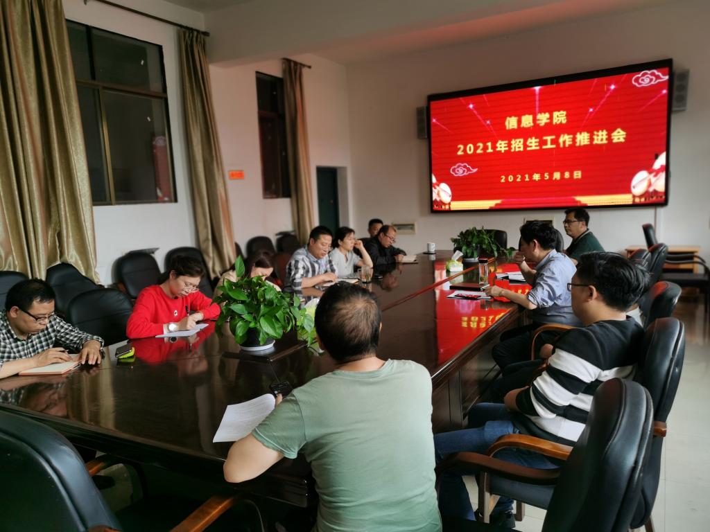 5月8日下午两点半,在百全楼211会议室信息学院组织召开2021年招生工作推进会。学院党总支书记谭甲凡主持会议,院领导刘浩院长、朱高峰副院长、陈淑红副院长、全体教研室主任、招生专干及广告公司代表参会。