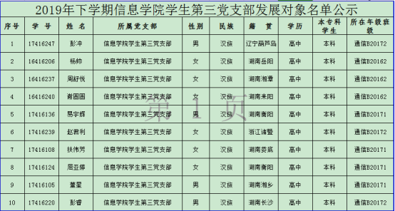 2019年10月23日下午,信息学院学生第三党支部在百全楼101讨论党员发展对象事宜,经支部委员会研究,将周舒悦等10名同志列为发展对象。根据发展党员工作有关要求,现将其有关情况予以公示(见附表)。
