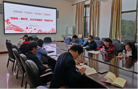 10月22日下午4点30分,信息学院党总支在百全楼211会议室组织开展了“担使命,履职责,矢志为民服务”专题研讨会,信息学院党总支委员、支部书记参加了本次研讨。机关党委书记刘纲华、组织部党建管理科科长辛浩林参会指导。