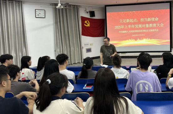 5月29日晚,信息学院党总支以“立足新起点,担当新使命”为主题,召开2025年上半年发展对象教育大会,严把党员入口关,筑牢发展对象思想根基。会议由学院党总支专职组织员何书晴主持。