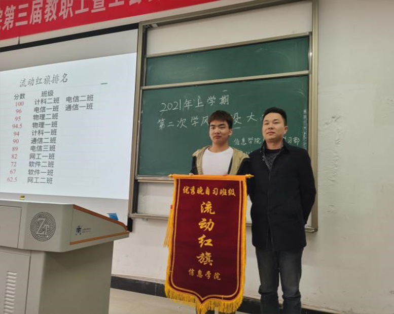 蔡伟华老师为优秀晚自习班级20级电信二班颁发流动红旗并发言。他强调,希望流动红旗能”流动”起来,做好常规工作,其他班级也能晚自习有更佳的表现。该班班长彭贵锋分享了一些班级管理的建议、班委的职责以及做法等。