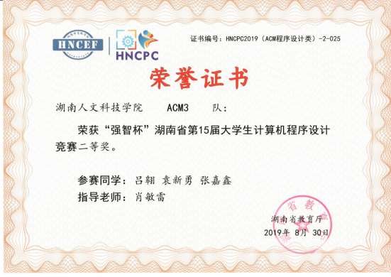 2019年8月29至30日,由湖南省教育厅主办,湖南省高教学会计算机教育专业委员会协办的第十五届“强智杯”湖南省大学生计算机程序设计竞赛在湖南师范大学举行。本次比赛分为ACM程序设计类,应用开发类,机器人高尔夫竞赛类三项赛事。