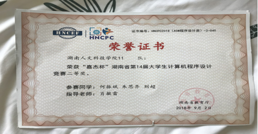 九月是收获的季节,2018年9月1-2日,由湖南省教育厅主办,湖南省高教学会计算机教育专业委员会协办,湖南农业大学承办的第14届“嘉杰杯”湖南省大学生计算机程序设计竞赛在湖南农业大学举行。KY官网计算机科学与技术一班何振斌、朱思齐、刘超三人在指导老师肖敏雷的帮助下,荣获了湖南省教育厅颁布的“嘉杰杯”湖南省第14届大学生计算机程序设计竞赛二等奖。