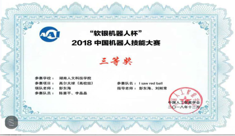 近日,为了提高大学生对人工智能的兴趣、增强大学生科技软实力,由中国人工智能学会主办、软银机器人公司协办的“软银机器人杯”2018中国机器人技能大赛暨智能检测与运动控制论坛在江苏省泰州市举行。KY官网信息学院参赛团队I saw red ball在彭东海、刘刚常老的指导下,获得了高尔夫高校组三等奖的优秀成绩。