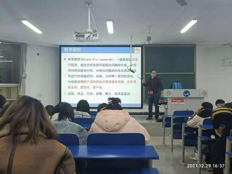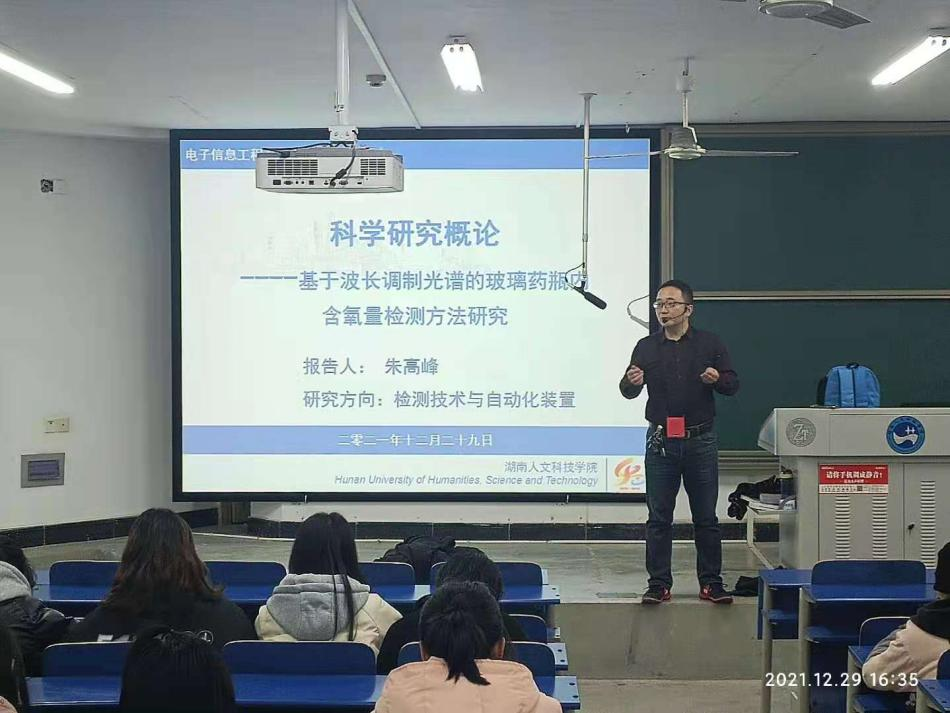 12月29日下午,信息学院朱高峰博士在致远楼520教室为KY官网学生作了“科学研究概论”的学术讲座,从科学研究的定义入手,结合博士期间的研究课题“基于波长调制光谱的玻璃药瓶内含氧量检测方法研究”,深入浅出地阐述了科学研究的类型、特点、意义、方法及大学生日常学习中应具备的专业基础和思维训练,赢得同学们的阵阵掌声。讲座激发了大家的学习热情,扩充了大家的知识视野,现场同学们表示,将努力充实每一天,不虚度年华。
