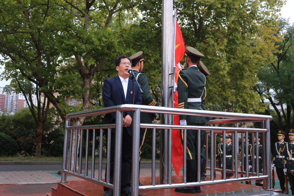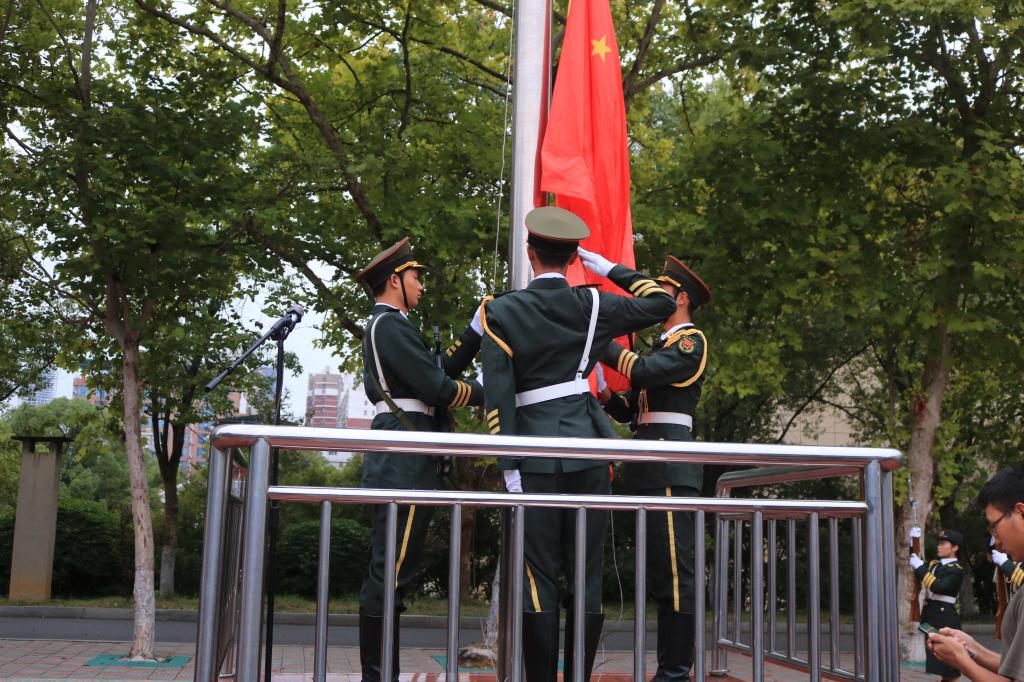 活动第一阶段为升旗仪式。伴着激昂的出旗乐曲,英姿飒爽的国旗护卫队高举旗帜,迈着坚定又有力的步伐,护卫五星红旗入场。随着五星红旗冉冉升起,全体师生庄严肃立,齐唱国歌,行注目礼。新生代表物理二班朱慧琳同学进行国旗下的演讲,“以青年之理想,绘中国之愿景”表达新时代青年志存高远,不惧挑战,青年有担当,国家有希望。刘宗良副书记发表致辞,鼓励广大同学将梦想与国家发展结合,遵守法律校纪,尊敬师长,关爱同学,强身健体,注意安全,宣读了信息学院双节期间安全告知书,最后宣布升旗仪式结束,非大一新生有序离场。