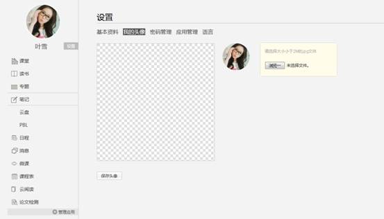 我的头像功能可以设置学生空间头像,点击浏览在本地上传后保存,头像就会显示在学生空间。