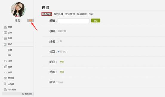 基本资料设置,同学们通过本页设置可以实现绑定邮箱、填写手机号的功能。