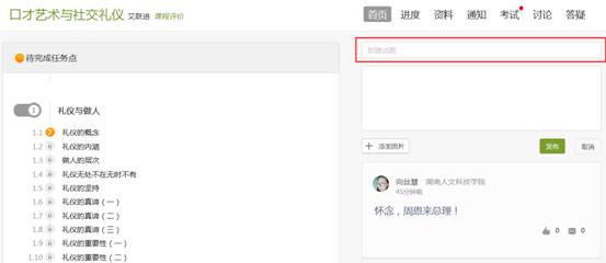 在学习页面的右侧可以发起讨论,查看、回复该课程本班内所有老师、同学的讨论。填写讨论的标题、内容,可以选择讨论的章节范围,点击发布。即完成发起讨论的操作。