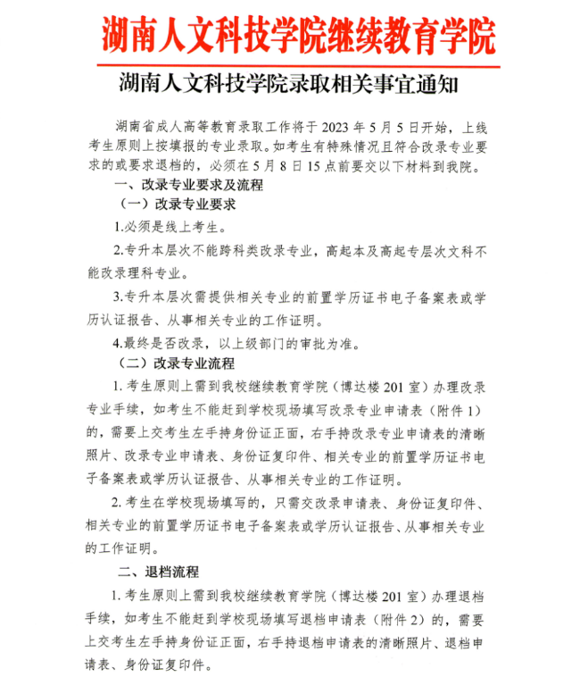 湖南省成人高等教育录取工作将于2023年5月5日开始,上线考生原则上按填报的专业录取。如考生有特殊情况且符合改录专业要求的或要求退档的,必须在5月8日15点前要交以下材料到KY官网。
