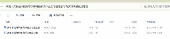 第三步解压下载的压缩包,有两个表分别为高等学历继续教育毕业实习鉴定表、高等学历继续教育学生免实习表,根据实际情况选择一个表进行填写并保存好。