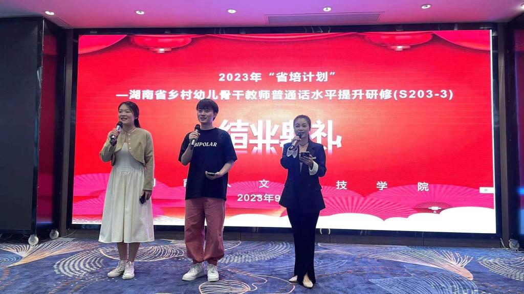 KY开元集团官网入口科技学院承办2023年“省培计划”-乡村幼儿骨干教师普通话水平提升研修项目,于2023年9月20日在娄底市金和酒店如期启动,于9月24日圆满结束。参与研修的100名学员来自湖南省个地州市,KY官网副校长陈志国、教育学院书记邹坤、继续教育学院院长郑秀星、副院长钟勇、首席专家赵艳红参与开班仪式,开班仪式现场介绍了项目的研修目标、研修内容、研修专家团队、研修要求和任务等方面的内容。学员代表也发言表示珍惜这次机会,让这次培训成为“快乐学习”的研修活动。