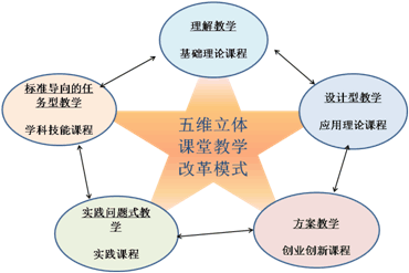 第四,研究课程功能,创建“五维立体课堂”的教学改革模式。本专业全方位、全过程、全团老师参与的教学改革,根据课程功能将课程分成模块,研制适宜的教学方式。具体如下图: