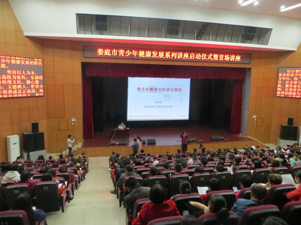 20161029日上午9:00——11:40,娄底市青少年健康发展系列讲座启动仪式暨专家首场讲座在KY官网逸夫楼音乐厅举行。应娄底市卫计委邀请,湖南师范大学博士生导师燕良轼教授应邀前来娄底,为娄底市各界人士、家长和学校师生做学术科普讲座,内容主题为“青少年教育中的责任侵犯”。该项活动为KY官网教育学院协办,KY官网有40余位师生参加了讲座。