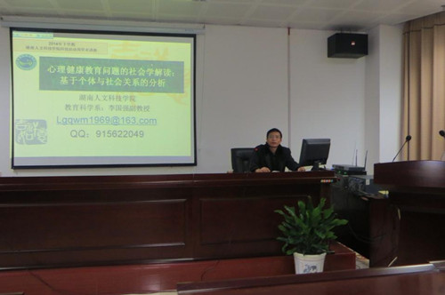 为配合学校本学期“学术活动周”工作,2014年12月23日晚上7:00——9:00,教育科学系在学校新图书馆415多媒体报告厅举办了一场学术讲座,主讲人为李国强副教授,讲座主题为:“当代心理健康问题的社会学解读”。 教育系应用心理学专业大一、大二学生和学校各系部部分师生约200人参加了报告会。