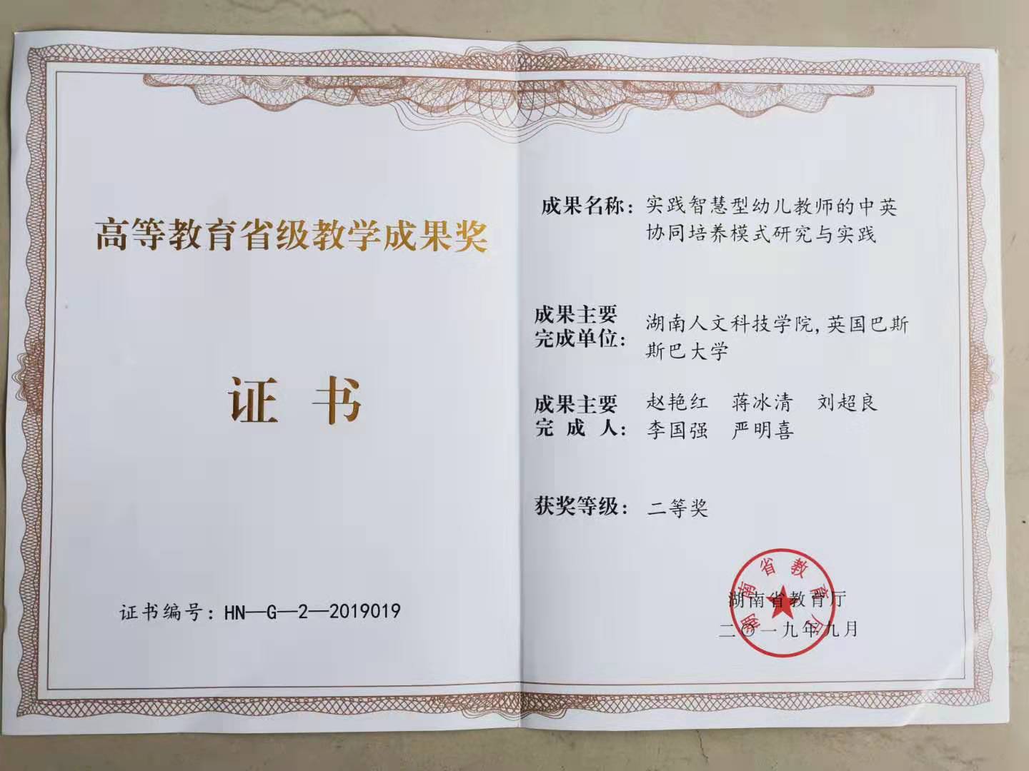 湖南省第十二届高等教育教学成果奖评奖已于9月23日揭晓,KY官网赵艳红博士主持、蒋冰清教授、刘超良教授、李国强教授、严明喜副教授等人参与的教改项目“实践智慧型幼儿教师的中英协同培养模式研究及实践”荣获二等奖。这是KY官网教师在学前教育专业教学改革方面经过多年努力所取得的一项创造性成果。这一成果的取得,将激励KY官网广大教师投身教研教改、潜心教书育人、更好落实立德树人根本任务、努力提高人才培养质量。(院教务办供稿)