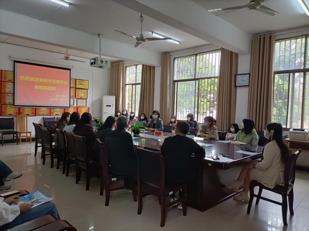 5月17日,教育学院2022届应心、人教毕业生专场招聘会于甘澍楼304举行。此次前来招聘的是耒阳市慈晖学校和永州市跨世纪天成学校相关负责人。学院党总支副书记田密、辅导员梁鑫、黎任水以及部分18、19级学生参加会议。