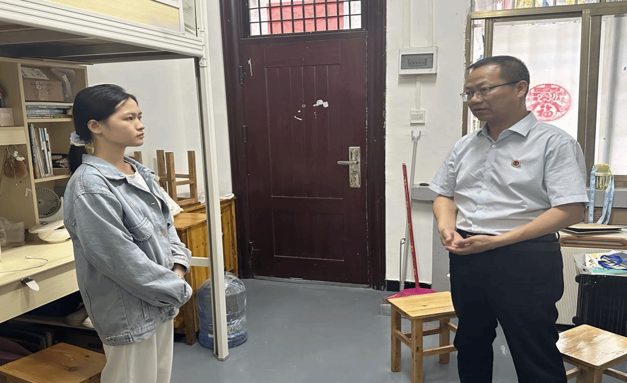 陈勇查看了寝室卫生和设施情况,了解同学们的职业发展规划想法,强调了要通过四年时间努力学习,合理规划未来,实现个人目标,展现人文学子精气神,展现新时代大学生风貌。他广泛听取学生们的意见,针对同学们提出的问题,及时给出反馈和解决方案,并鼓励同学们遇到问题及时与老师沟通。