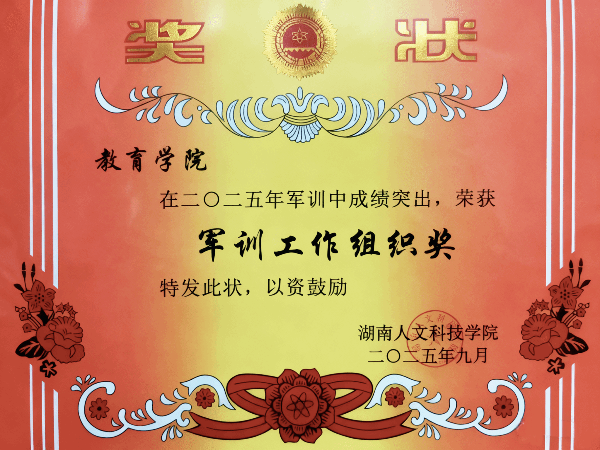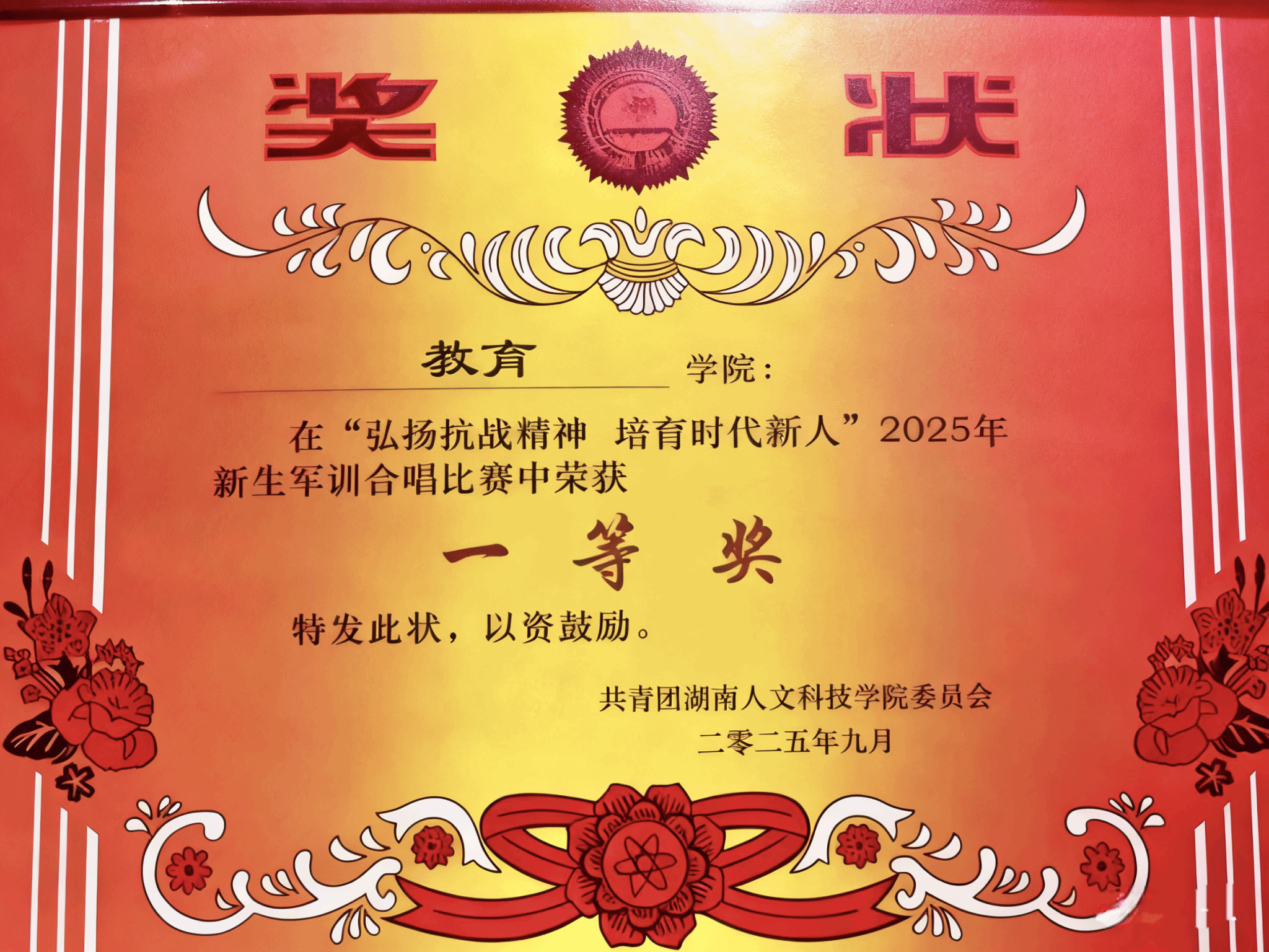 此外,9月28日晚,教育学院在2025年新生军训合唱比赛中荣获一等奖。教院学子以一首《十送红军》再现了红军行军途中与百姓相依、历经艰险仍坚守信念的故事。同学们以歌传情,尽显昂扬向上的精神风貌,在歌咏中学习红色精神、发扬红色传统,让红色文化在新时代青年中薪火相传。