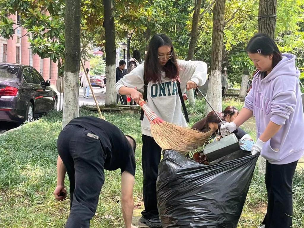 为了共建美丽校园,同学们手握工具分散至花坛、草地等各处进行清扫。有的同学戴着手套,弯腰捡起地上的白色垃圾和烟蒂,不遗漏任何一处地方;有的同学拿着扫把和撮箕,清扫过道上的落叶。经过同学们的辛勤劳动,校园一隅脱旧装换新衣,被覆盖着的绿草逐渐露出。