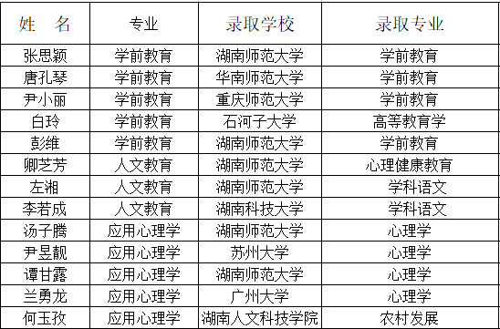 教育学院2018届人文教育、学前教育、应用心理学3个专业毕业班共计179人,38名学生报名参加2018年全国高校硕士研究生招生考试,20人上国家线或进入报考学校的复试,左湘等13名学生被录取(名单见附表)。