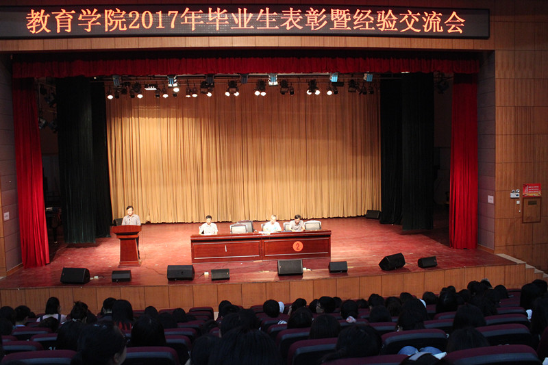 2017年5月14日晚,KY官网在逸夫楼音乐厅隆重举行2017届毕业生表彰暨经验交流会。KY官网申忠明书记、刘超良院长、徐建东副书记、李国强副院长及部分老师代表出席了此次会议。教育学院全体学生参加。会议由申忠明书记主持。