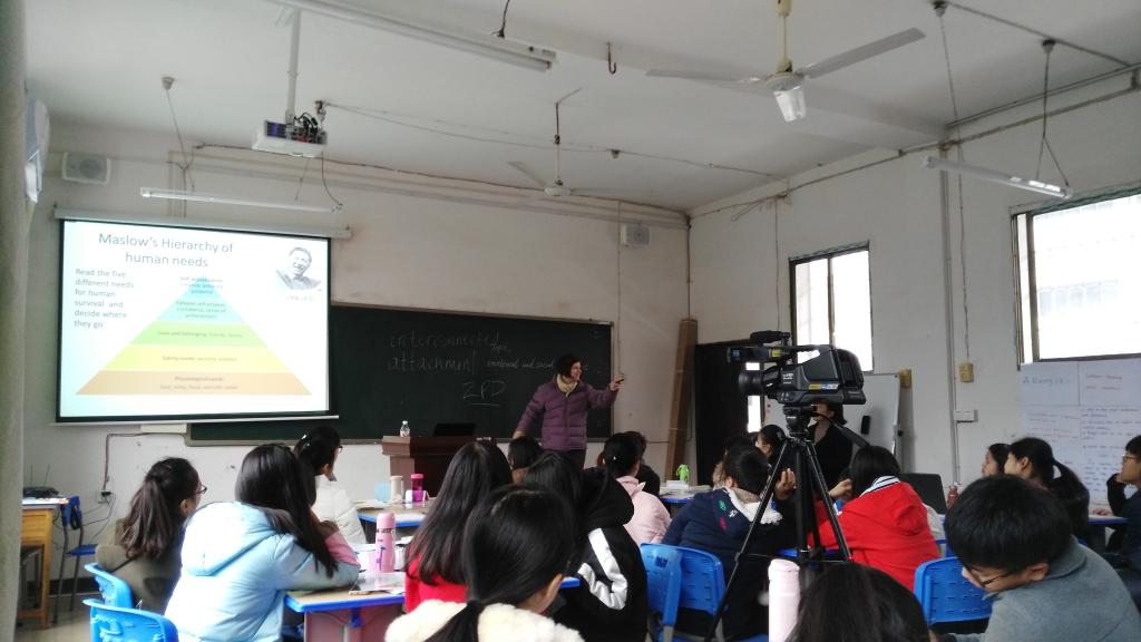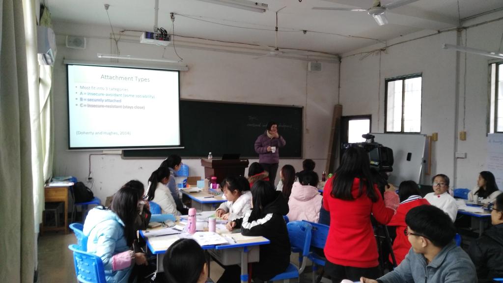 根据学校《校系教研室三级公开课实施办法》(院政发〔2011〕5号)文件的精神,第14周周二( 2016 年11 月29日)上午第3节课 10:20—11:05,在甘澍楼408多媒体教室,本学期教育学院特委托学前教育教研室举办一次学院层面的公开课,任课教师为来自英国巴斯斯巴大学教育学院的Alyson Lewis博士。课程主题为:《儿童发展心理学》——“Attavhment Type”(依恋类型),授课班级为学前教育(中外合作办学)B20161班。教育院当天下午无课在岗的专业教师和兄弟院系闻讯而来的教师共10余人参加了公开课。