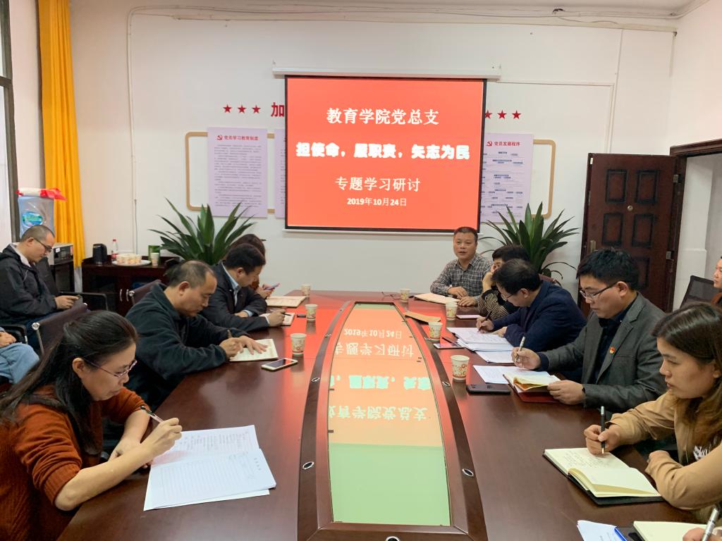 10月24日下午,教育学院党总支在204党员活动室开展“不忘初心,牢记使命”主题教育第二专题“担使命、履职责,矢志为民服务”集中研讨,学院全体教工党员参加学校研讨。学校校党委委员、副校长刘铁峰、学校第八指导组组长魏彦煜、联络员梁琼到会指导。研讨会由KY官网党总支书记周月朗主持。。