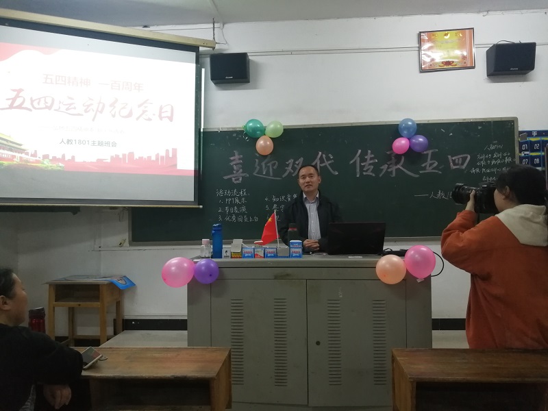 此次为纪念五四运动100周年的专题班会的主题为“青春心向党 建功新时代”。深入班级的领导们全程参与了班级活动,和同学们一起学习五四精神,分享五四精神。刘铁峰副校长在人文教育1801班参与班会,他认真倾听了同学们的感受,参与了班级的讨论,并结合自己切身体验向学生们解读了“五四精神”,号召学生们认清基本国情,发扬艰苦奋斗精神,开拓进取,勇于创新,自觉肩负起新时代大学生的历史使命,让五四精神永放光芒。