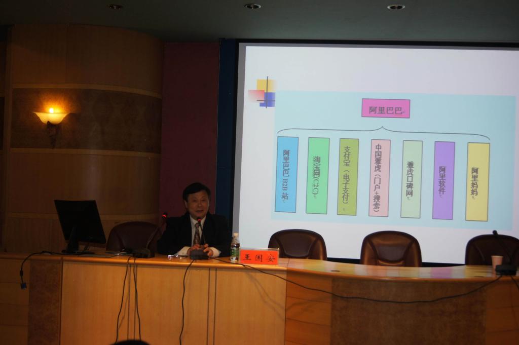 王国安教授早前与阿里巴巴创始人马云执教于同一学校,曾与阿里巴巴联合开办阿里学院培养电子商务人才。在《阿里巴巴的营销策略》课题的讲解中,王教授细数在马云在创业之初的雄才伟略、远见卓识以及那些鲜为人知的艰辛故事,用故事引领同学们进入到阿里巴巴的世界。王教授详细的介绍了阿里巴巴旗下的淘宝、支付宝等知名名牌的运营模式,深入剖析了阿里巴巴建立电子商务平台,突破网络不能确保诚信交易的瓶颈,建立网络诚信交易机制的营销模式。王教授深入浅出的讲解揭开了阿里巴巴神秘的面纱,引起了同学们浓厚的兴趣。在短短的两个小时的讲座中,有几十位同学结合王教授的讲座内容以纸条的方式提出自己感兴趣的问题请王教授给予解答,王教授睿智的解答引得现场掌声连连。