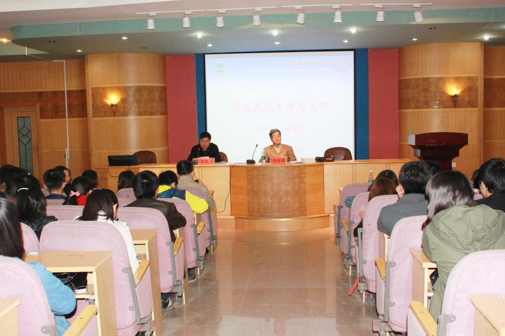 讲座中,游宇明先生讲述了民国时期大学的教授民主治校、个性化教学、尊重人才、关心学生等特点,同时也阐述了民国时期大师有骨气、有爱国心、多才多艺的内涵,并就当今大学的现状提出了进一步尊重人才,充分调动知识份子的积极性等方面的建议。讲座让师生了解了民国时期大学与大师的深刻内涵,给在坐的师生留下了深刻的思考。之后,同学们提出了系列问题,游宇明先生给予了回答并当场向提问者签名发放了其力作《不为繁华易素心,民国大学与大师风骨》,深受学生欢迎。最后,陈昌永教授对讲座进行了总结,并提出了“视野、韧性、成就”六字与同学共勉,讲座在热烈的掌声中结束。