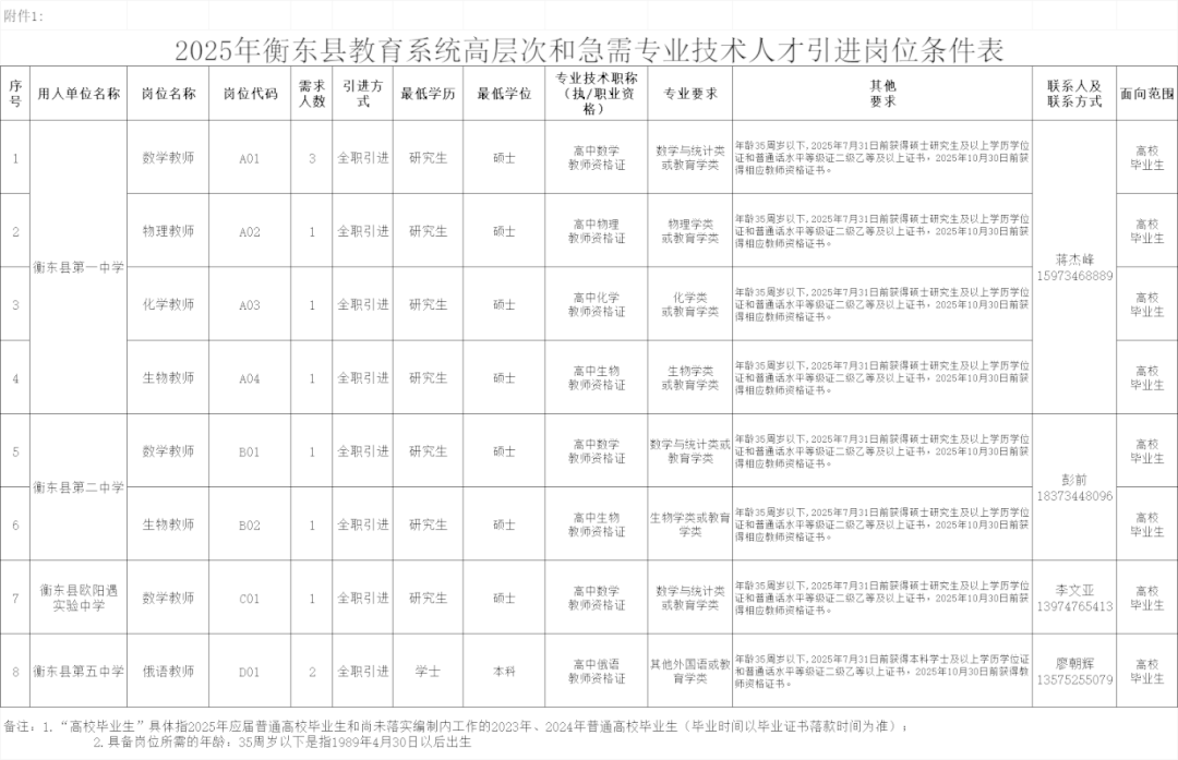 根据《事业单位人事管理条例》(国务院令第652号)《湖南省事业单位公开招聘人员办法》(湘人社规〔2025〕1号)及《衡东县“十四五”人才行动规划》(东发〔2023〕11号)《衡东县县属企事业单位人才引进实施办法》,经研究,衡东县教育系统决定面向社会公开引进一批高层次及急需紧缺专业技术人才,现公告如下。