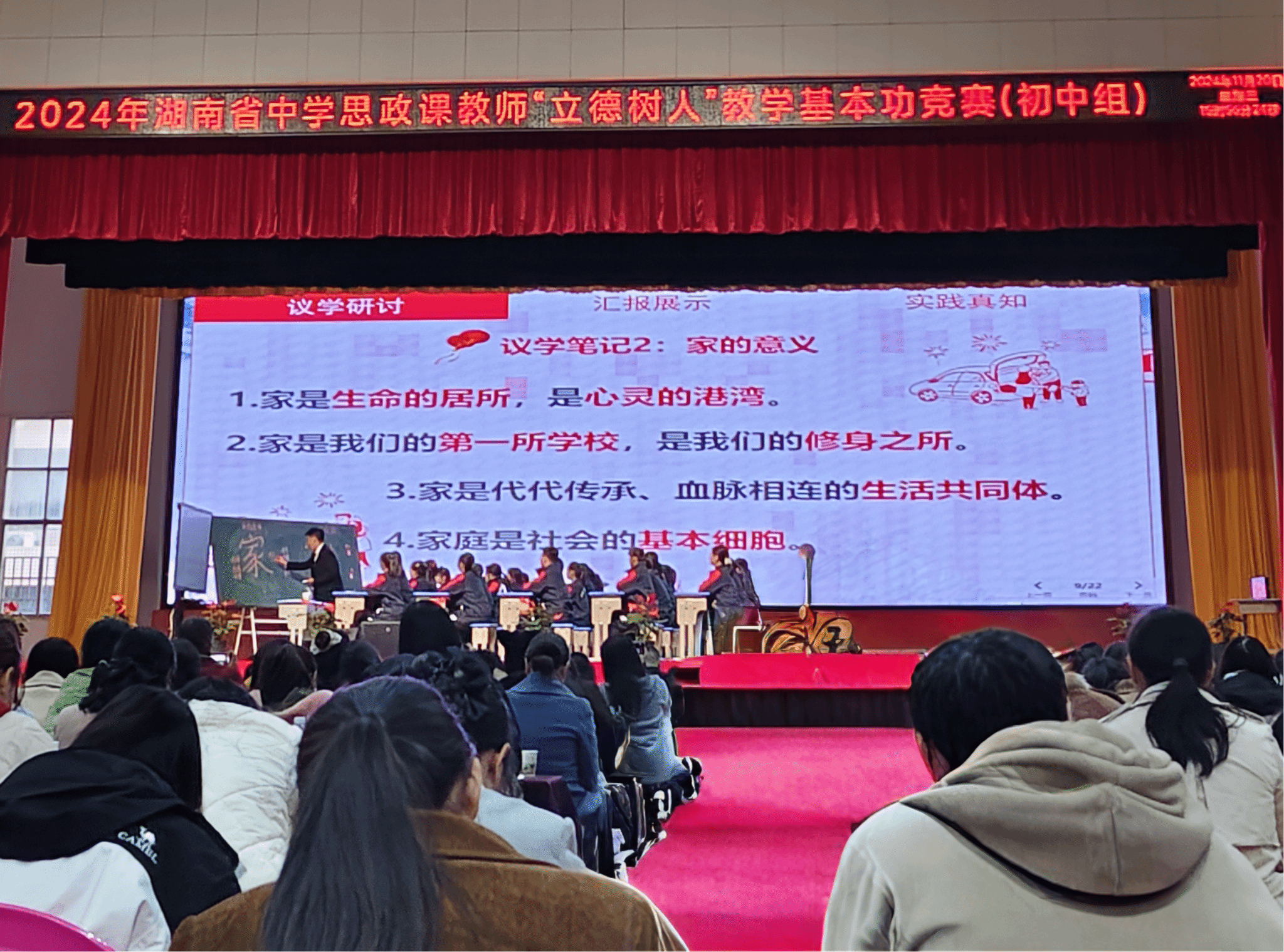 11月20日下午,2024年湖南省中学思政课教师立德树人教学基本功竞赛(初中组)在娄底市第一中学附属实验学校圆满举办。马克思主义学院刘莎、康珏、孟欢三位老师带领22级全体学生前往观摩学习。